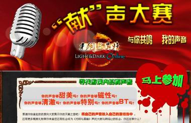 “寻找游戏中的真声音”献“声”大赛在12月25日已经拉开帷幕。此次活动由由《光明与黑暗(专题 截图)OL》的运营公司上海巍毅软件技术有限公司与太平洋游戏网联合举办的。而在活动开启后近几日内,玩家热情高涨,好几次造成网页无法打开的状况。