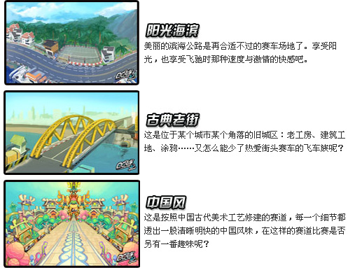 阳光海滨,度假的黄金选择!悠然和浪漫洒满小路,当然了,激情燃烧的赛车手们,别忘了风驰电掣的较量哦!古典老街,也许这是一个被遗忘的角落。但《QQ飞车》将唤醒她的活力,老式公房、建筑工地,带您穿越时空找寻旧日老城市的点滴记忆。