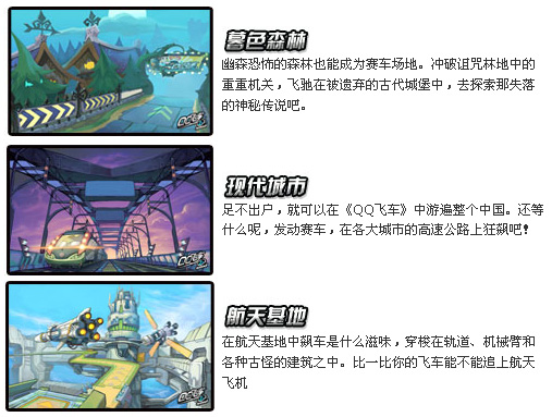 《QQ飞车》为您精心设计了6种风格迥异的主题赛道,为您呈现“飞”常变化的奇妙世界。穿越诡秘的暮色森林,去寻觅很久以前的神秘传说;在飞车国度中您可以轻轻松松畅游现代各大都市,在现代城市中尽情狂飚,一个字,爽!您想追赶快如流星的航天飞机么?您想去到科技王国做一次传奇的旅行么?穿梭在航天基地中,一路上各种奇形怪状的机械和建筑,将带给您无穷无尽的新鲜和奇趣。