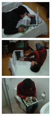 哇!下面这位同学!你躺着玩你的笔记本已经对你有意见了,你竟然还把它带到厕所里!小心它受不了某种气味罢工哦!