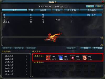 此外,提升基本兵法的等级还有一个更加重要的作用,那就是获得结义的衍生兵法!在玩家建立结义之初,就能够立即获得第一个衍生兵法“文经武略”,拥有这个兵法之后,所有在线的结义玩家都可以互相分享对方的历练值,也就是说某个结义一旦拥有了这个兵法,那么结义中的玩家只要在线,即使什么都不做,也能分享到结义兄弟的历练值。