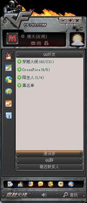 厚重而不阴霾的深色基调与游戏中的主色调有机的结合为一体,皮肤上方熊熊燃烧的战火、手持武器的现代雇佣兵正目不转睛的注视着前方;下面充满金属质感的QQ面版栏目,会随着鼠标的点击和移动做出微妙的色彩上的变化,无论鼠标指到哪里,都会有一屡金光将你的前路照亮。面版中对称散落的金属钉,更让大家感受到来自游戏中的无限气息。仿佛在我们和朋友交流聊天的同时,也将CF游戏气息带给了朋友们,让自己充分感受回味游戏中的激情战斗。
