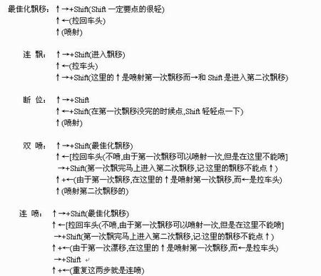 其中的+号表示的顺序,如果没的+号的就是要同时一起按的。这几种方法点Shift键都要很轻,如果重了车就要打滑,这样不但不能喷射,而且还减慢了车的速度。