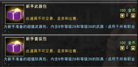 1)新手套装包:为新手准备的超值防具包,内含6件等级28和等级36的[精]防具(适用于所有职业)。内含[精]轻皮甲、[精]粗布外套、[精]火焰法袍、[精]硬皮甲、[精]棉织外套、[精]地狱火袍各一件。