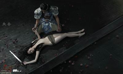 这幅画太过于唯美,衬托不出这悲情的气氛,只有那淡淡的水波诉说着已经逝去的爱情。这张图片把故事画上了悲情的句号。子龙跪在爱妻身旁,紧握她的双手,悲痛的低下了头颅。也许只有这样紧握着,才能再回忆快乐的过去。