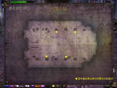 (一)第一张地图:自然水晶房。这张地图很小,只要顺利点燃大厅周围的魔法灯,即可顺利过关。图中黄色的点即代表需要点灯之处。