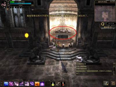 (1)从(1)处前往(2),当走过狭长的通道时回触发毒雾机关。进入(2)以后,点击下图中的棺材两次,将会出现93级首领“祭坛战士”,将其杀死。