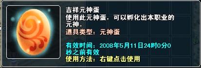 玩家在活动时间内参加每天的师门荣耀活动,在点击师门宝藏时有机会获得元神蛋一个,玩家打开元神蛋后有100%的几率会得到一个对应职业的中阶元神,元神等级为40级,附体等级为40级。元神的属性至少4条,技能至少为中阶2个,看看你的运气,说不定能得到极品元神哦。元神蛋开启有效期为5月11日24点0分0秒。