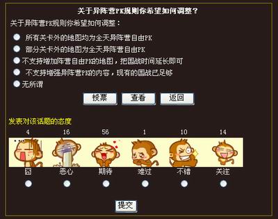 第一期“玩家话题投票”大选已经正式拉开帷幕!大家可以看到我们已经推出了一系列与游戏PK有关的投票话题,如您是否支持开放同阵营自由PK?关于异阵营PK规则你希望如何调整?你对PK死亡可能掉落装备的看法?你希望什么情况下PK死亡可能掉落道具?……通过这些话题玩家的投票,我们将更进一步了解到玩家心目中对游戏的想法,以便于我们更好地将游戏完善与调整!