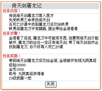 “武林至尊,宝刀屠龙,号令天下,莫敢不从,倚天不出,谁与争锋?”这一段话相信喜好武侠小说的玩家都分外熟悉,不过倚天剑和屠龙刀跑到了日落大陆来,这就不能说不是一种恶搞了!而且这位任务设计者不但把两把神兵利器带了过来,就连九阴真经都没放过,不过拿到手了会不会练就另当别论了!