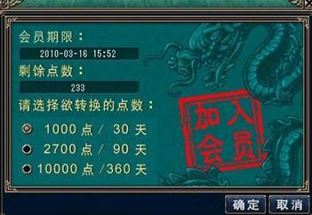 1000点转月会员身份,会员身份以现实时间为时间长度,1000点/30天。