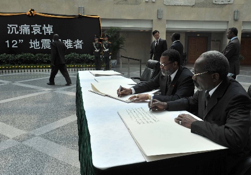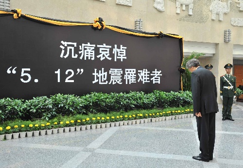 世界各国驻华使节前往中国外交部,沉痛吊唁四川大地震罹难者。中新社发 廖文静 摄