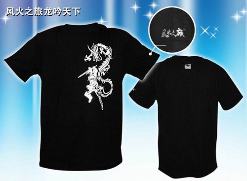 现在,《风火之旅》铂金版限量“龙吟天下”T恤限量208件,隆重登陆久游周边商城,正式对外发售!此次铂金限量“龙吟天下”T恤的选料也是经过严格挑选,穿着舒适,柔软有弹性,透气性极佳,运动休闲皆适宜。T恤成分为100%棉,螺纹领,前后片烫银。超酷、超帅的服装设计绝对是你不能错过的!做“龙吟天下”、叱诧风云的真英雄!