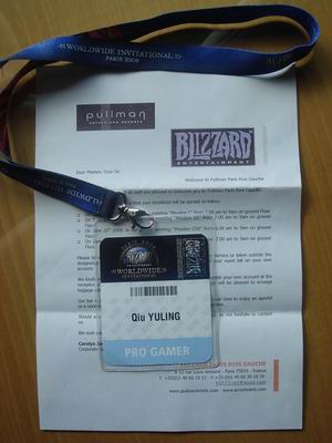 这是《魔兽世界》中国玩家仇于凌的胸牌,在之前《魔兽世界》竞技场全国挑战赛中在上万支战队中脱颖而出,从而赢得暴雪此次法国大展的盛情邀请,以及第九城市的全资赞助。过2天他和另外2名队友王可珂、沈麟,将和另外世界上最顶尖的15队《魔兽世界》选手同台竞技,一较高下。希望他们能取得好成绩,为中国玩家争光。