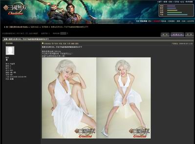 真三国无双OL官方COS选拔开始以来,就吸引了数十位国内知名COS的报名。现在整个比赛已经进入最后一周的票选了。但尽管如此,还是有玩家特意在无双的官网论坛上发帖,想以自己独特的梦露造型来入选真三COS。不知道这次天希会不会破例邀请这位性感美女呢?还是等待小编的后续报道吧!