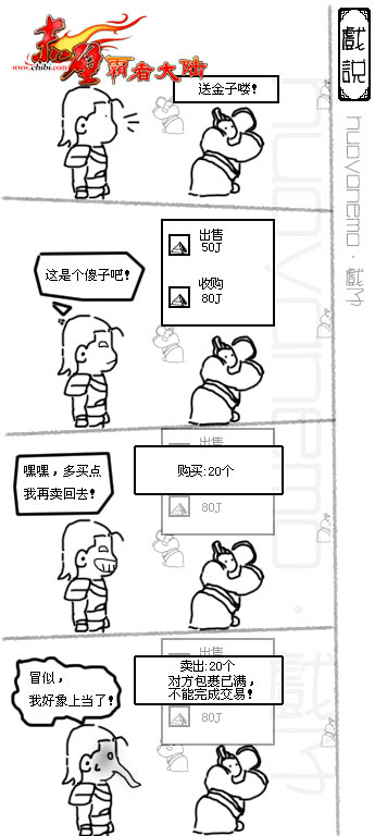 说起摆摊,大家一定会记得可爱又迷糊的玩家竹子,经常因为摆摊损失掉大量的金钱。而今天戏子却是被奸商摆的摊位敲诈了一番,戏子承认自己因为一时贪便宜而遭受了莫大的损失,记住教训的同时,更将其绘制出来,希望提醒各位玩家不要犯同样的错误,更希望玩家在看到如此真实的四格漫画可以会心一笑。