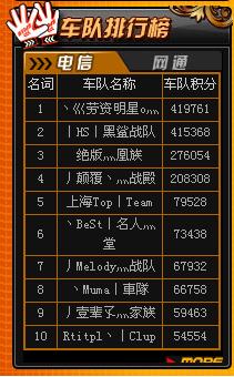 入主三甲的车队,他们的名字将被永久地录入《QQ飞车(专区 截图)》名人堂,他们的荣誉将永远地在《QQ飞车》的名人录里熠熠生辉。另外,他们将获得速度与灵敏度齐驱的针尖的一个月的试用期。同时,三甲车队还将分别获得冠亚季军的背景房间以及3000~1000不等的积分奖励,进入前十名的其他车队,也将获得800积分奖励。奖励今天已经发放,请各获奖车队查收。