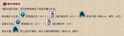 幸运强化大礼包包括了20个极级强化石、50个强化稳定剂以及幸运斗篷,而运强化礼包则包含了4个极级强化石和10个强化稳定剂!拥有这两个礼包,一定会让你在强化武器装备时无往而不利,轻轻松松就能打造出强大的属性,让你披坚执锐奋勇前进!