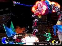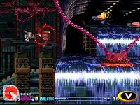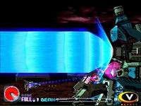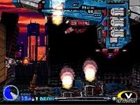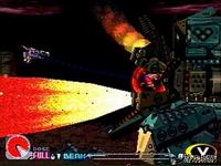 游戏的最大特色就是使用了3D化的背景画面,这一点在SS的“闪电出击5”以及PS的“独臂擎天”、“G太空战斗机”中已经为玩家所熟悉,而在本作中3D技术的运用显得更加纯熟,画面的色彩也更加艳丽。IREM一直以来就在画面美工方面有着独到的功力,与“闪电出击5”采取远景镜头的纵深背景来营造画面的磅礴气势不同,本作中无论是角色还是背景都有着更大的比例,整个画面显得更加紧凑,更适合表现白热化的近战场面,这一点也正是系列一直以来所擅长的。