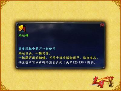 当玩家购买到“描金葫芦”之后,只需使用全新上架的“鸿运锤”,即可轻松砸开“描金葫芦”。即可随机获得“相马经·赤兔”、“相马经·的卢”、“相马经·绝影”、“相马经·爪黄飞电”、“相马经·异兽”当中的任意一种,而这些可是兑换四大名马以及异兽雪熊的重要道具哦。