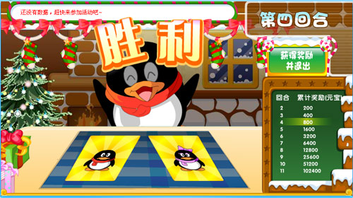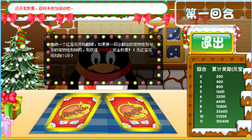 从12月4日起,QQ宠物企鹅社区将要举办“翻牌猜猜猜”,为这个激情四溢的08年画上一个完美的句号。这个活动很简单,Q宠宝贝们只要花费1个红宝石就可以参加翻牌,每次翻中的牌如果和宠物的性别相同,则可以进入下一回合。每次的胜率都是固定的,都是50%,每次猜测正确都有奖励,其中第一回合奖励为200元宝,以后的奖励越来越高,最高奖励可达102400元宝!