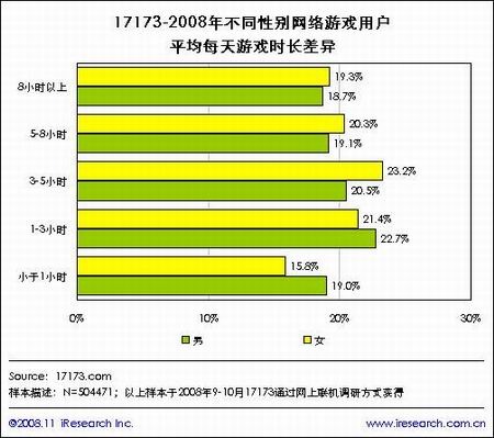 此外与07年相比,每天游戏时间5小时以上用户增长幅度较大,特别是5-8小时区间提高了11.5%,而1-5小时的用户相应减少,07年在这一区间的用户为70%,而到08年这比例下降为49.2%,由此可见游戏用户的黏着度提高很快。