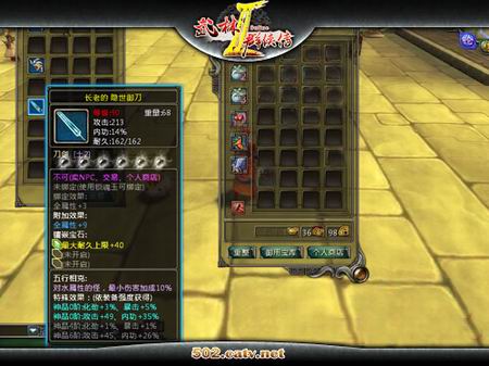 只有门派长老才能拥有的“隐世御刀”、“隐世御爪”、“隐世御棍”这三件绝世神兵,将成为《武林群侠传2》中最为惊世骇俗的华丽武器。它们无可比拟的优越属性超越了目前游戏中任何一件兵器,为最高级的“神品”级金色装备。全属性+9的初始附加属性以及先天拥有的2个特殊效果,就足以让所有武林人士垂涎不已;而随着将它强化至6阶,更可以使其拥有全属性+15以及4个特殊效果的超强悍状态,这绝对是其它任何装备都无法望其项背的神兵利器。