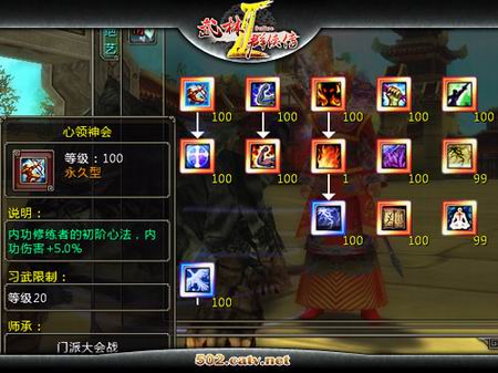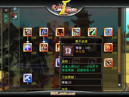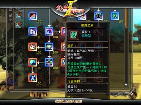 习得100级后,可使自身气血基本值上升50%,防御力+100 ,消耗一颗战意光球