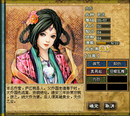 大乔国色流离,姿貌绝伦,是公认的三国美人之一。在《三国鼎立》中,她化身吴国文官魅惑歌姬,其高机率的“真再起”让其他歌姬望尘莫及。