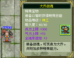 “大乔战魂”不仅能将武将变身为美女大乔,还拥有贴合文官需求的珍贵属性,可为装备的武将提升兵力300、气力70、全地形适性3!