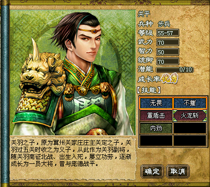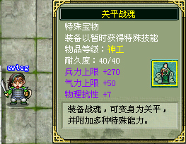 “关平战魂”附着着武官必须的特殊能力,能为装备的武将兵力上限+270、气力上限+50、武力抗性+7!