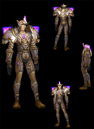 评论:从T4套开始,暴雪的整体设计思路就开始有所变化了。针对游戏背景的变化,套装的颜色、造型也更加符合外域的特点,但T4套整体给人的感觉还是缺乏亮点,中规中矩。