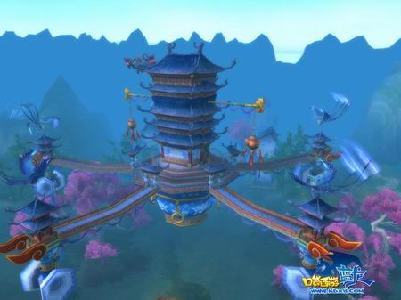 女儿国场景中的标志建筑——玉**,整个楼阁悬浮于半空,主楼与四栋偏楼交相辉映,四条五彩凤凰环绕于四周,整体建筑富丽堂皇,无论是平地远眺还是驾云俯望都尽显磅礴气势。
