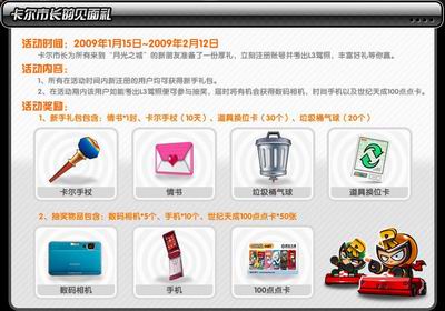 随着《跑跑卡丁车》4th lap月光侠影的开放,月光之城的卡尔**为了迎接车手们的到来,特地为大家准备了一份丰厚的礼物,活动期间新注册的车手都能够获得包含了情书、道具换位卡、卡尔手杖和垃圾桶气球的新手礼包!如果活动期间新注册的车手能够考取L3驾照,就能够参加抽奖赢得数码相机、手机和世纪天成游戏点卡!
