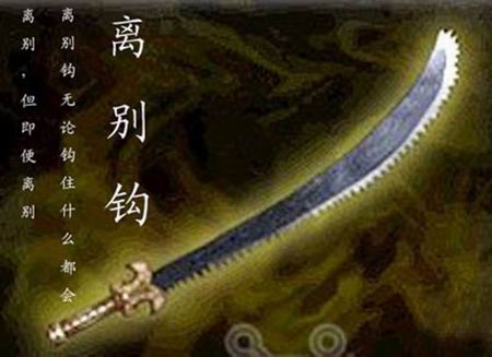 离别钩——既不像刀,也不像剑,前锋虽然弯曲如钩,却又不是钩,是形状怪异的四不像。古龙《七种武器》中所描述的“离别钩”大抵是这个样子。为什么它叫“离别”钩?“因为我不愿被人强迫与我所爱的人离别。”可见离别钩的霸气与残酷。
