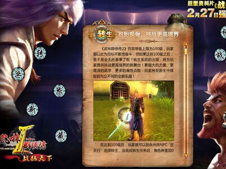 在这里还要告诉大家一个好消息,无数玩家翘首期盼已久的电信、网通新服,也将于2月27日与《武林群侠传2》新资料片“战据天下”同期开放,为广大新老玩家提供全新的舞台。在新服中,每一位英雄侠客都将站在同一起跑线上,共同享受新资料片“战据天下”的辉煌盛世。同时,一系列面向新老玩家的线上线下活动更将璀璨登场,无数奢华大礼将毫无保留地奉献给广大玩家。可以预见,2月27日的《武林群侠传2》,必定是异常火爆!
