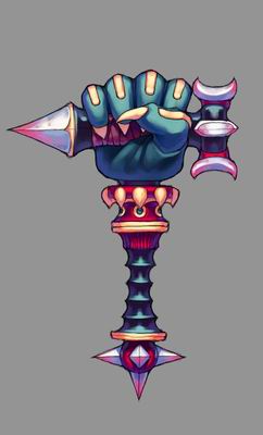 这是一把造型怪异的单手锤,整个锤子就像是一个绿色恶魔的手臂,巨大的拳头紧握一把似乎还沾着鲜血的“T”型钢钉!