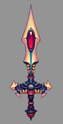 赤黄色的剑身镶嵌着一颗巨大的血色宝石,黄黑相间的剑柄上分布着12颗犹如魔鬼牙齿般的小装饰,从远处观望剑柄,似乎若隐若现出一张恶魔的脸庞,让人不寒而栗!