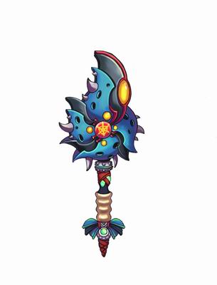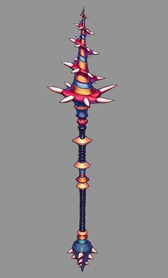 这把造型奇特的手杖由四瓣淡蓝色貌似贝壳状的物件组成,团团相抱从缝隙的窟窿中延伸出淡紫色的小刺。顶端巨大的黄色宝石和中心的红色符文,似乎在酝酿着新的诅咒!