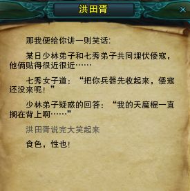 在接任务的时候,玩家会和NPC洪田胥对话,而洪田胥将给玩家讲这样一段笑话:某日,少林弟子和七秀弟子共同伏击五口,他俩贴得很近很近......七秀女子道:“把你的兵器先收起来,倭寇还没来呢!”少林弟子疑惑地回答:“我的天魔棍一直搁在背上啊......”汗......