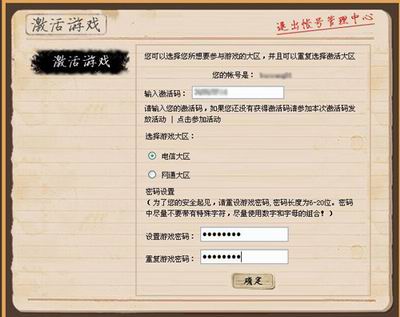 3、选择“激活游戏”进入下一环节,按页面引导输入“激活码”及选择激活大区后,再次设定游戏密码并确定,即成功激活《劲爆篮球》内测帐号。
