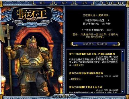 输入帐号和密码,进入游戏。竟然…,《魔兽世界》的排队系统?这一点我很理解,排队系统非常直观,至少让自己有个盼头,看好需要等待时间后,利用中间的时间洗个澡、喝杯咖啡,等待的时间也就过去了。不像《天堂2》开始公测的那会,全看RP,有的玩家从中午就开始重复着输入账号、密码,点击进入,跟着提示“系统忙,请稍后再试”,一直到下午4点,随着一声大吼,那位玩家才顺利进入游戏。有些幸运的玩家只用了不到10分钟就顺利进入游戏,这种尴尬的局面真让人有点抓狂了。