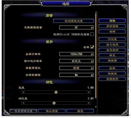 进入游戏后,首先调整画面质量,打开游戏选项,分辨率调整为1024×768,点选检测最佳设置,这项设置会根据自己电脑的配置自动给予最佳设定,以保持在游戏流畅的同时达到最佳画质。笔者的机器还算不错,自动检测给出的基本上都是最高的选项,有些不是最高也是高,总体来说还不错。