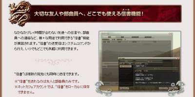 给那些经常因为时间不吻合而不能一起游戏的玩家留言以及和部曲成员的联络等都可以通过新的书信功能实现。接收和发送书信是通过系统命令实现的,所以随时随地都可以使用。