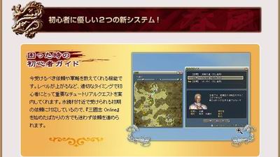 指导新玩家目前可以领取相应等级的任务及军略的功能。在适当的时机给予新玩家帮助。在水镜村(新手村)附近显示可以接受到的初期任务,所以可以帮助那些新近开始游戏的玩家不再困惑,顺利的进行游戏。