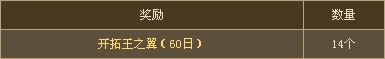 ※ 开拓王之翼(60日):利用五彩缤纷的孔雀翎毛制作的象征开拓王身份的装饰品。装备后攻击/防御等级增加1、攻击力增加10%、防御力增加10、生命值上限增加1500、将5%伤害力转换为生命值。