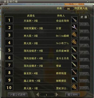 装备排行榜,极大满足你的成就感。只要点击“提交资料”按钮将玩家身上的所有装备资料上传进行排名,系统将在每天的凌晨一点整对玩家已提交的装备资料进行排行。