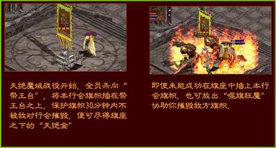 攻下天绝魔域的行会将可尽得掩埋于旗座之下的“天绝金”,使用天绝金可在游戏中换取“屠龙刀、稀有灵兽火麒麟等多种极品装备”。