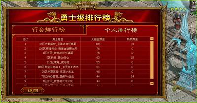 一场胜仗,路人皆知!您的行会在“天绝魔域”中赢得的每一场胜利,您在“天绝魔域”中消灭的每一个对手,均会在全区排行榜中得以体现。成为天下第一战,受全区勇士的膜拜!