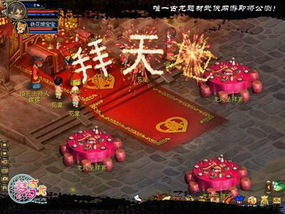 在婚宴地图内,新郎新娘可找媒婆向天下英豪广发邀请帖来婚宴地图观礼,此时江湖好汉们若有兴趣,就可从京城的红娘处进入婚宴地图凑凑热闹!没准新人派发喜糖的时候,也能有你一份呢!如果你身上拥有请帖,更可以入席享用酒宴(没有喜帖的一边站着看吧),酒席上可获得巨额经验和金钱奖励,吃不完的还能打包!